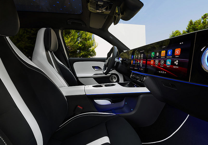Im Innenraum setzt der optionale MBUX Superscreen ein eindrucksvolles Statement. Hinter einer durchgehenden Glasfläche vereinen sich ein 10,25 Zoll großes Fahrerdisplay, das 14-Zoll-Zentraldisplay und ein ebenso großer Bildschirm für die Beifahrerseite zu einer modernen, hochauflösenden Erlebniswelt.