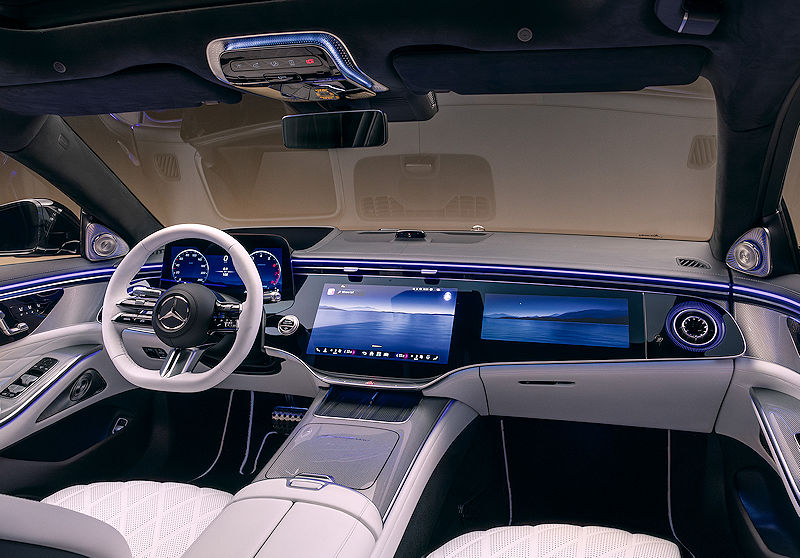 Im Innenraum zieht die nächste MBUX-Generation ein. Der Sprachassistent wird deutlich dialogfähiger, mehrere KI-Systeme arbeiten zusammen und ermöglichen natürlichere Gespräche, kontextbezogene Antworten und kurze Erinnerung an vorherige Anfragen. Der MBUX Superscreen spannt sich als durchgehende Glasfläche über Zentral- und Beifahrerdisplay, ergänzt um neue Anzeige- und Ambientemodi. Navigation basiert auf Google-Kartentechnologie, dazu kommt eine erweiterte 3D-Umgebungsdarstellung sowie ein Augmented-Reality-Head-up-Display, das Hinweise scheinbar direkt auf die Straße projiziert.