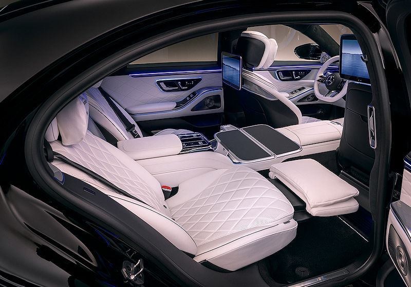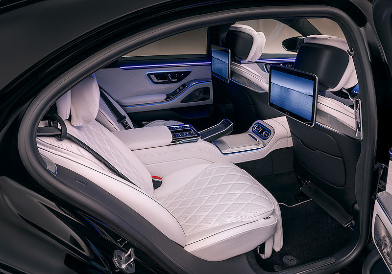 Im Fond wird die S-Klasse auf Wunsch zur rollenden Business-Lounge. Große Displays, abnehmbare Touch-Fernbedienungen und integrierte Kameras ermöglichen Videokonferenzen unterwegs. Streaming-Dienste und Entertainment-Apps sind direkt eingebunden, dazu kommen hochwertige Surround-Soundsysteme von Burmester.