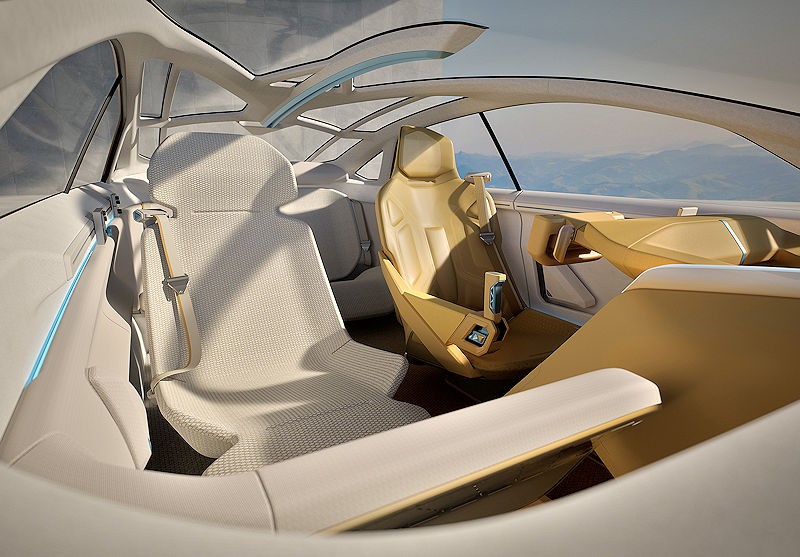 Daneben entsteht eine völlig andere Welt. Der Beifahrersitz wird zur Lounge, lässt sich drehen, öffnet den Raum und macht Platz für Inhalte, Erlebnisse und Interaktion. AR-Head-up-Display, immersive Darstellung, neue Perspektiven.