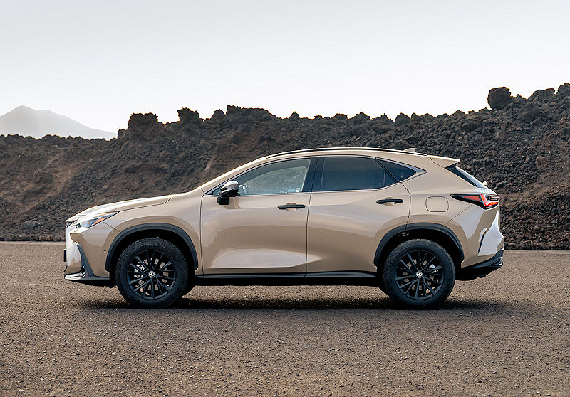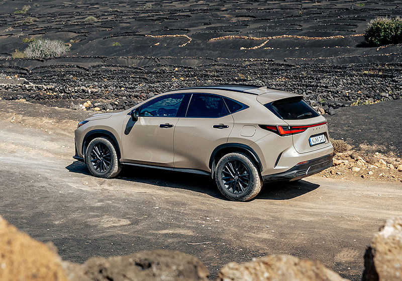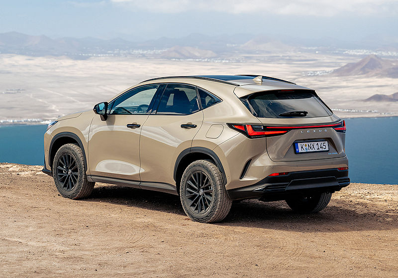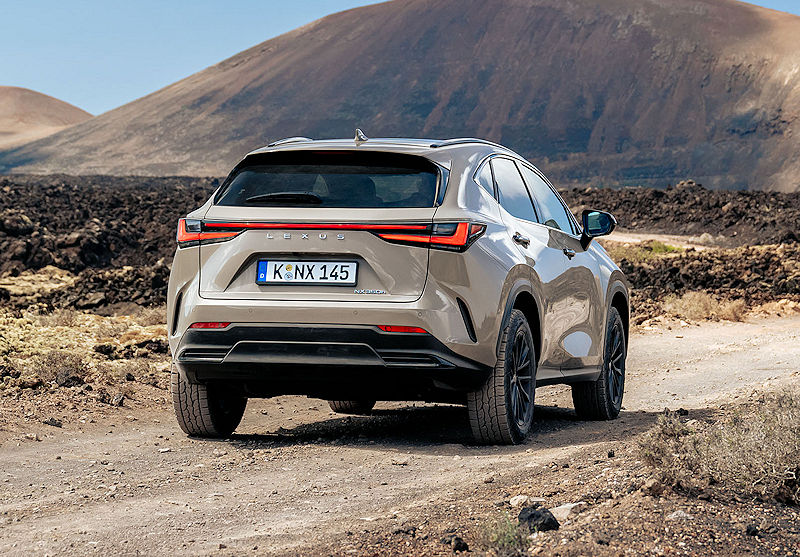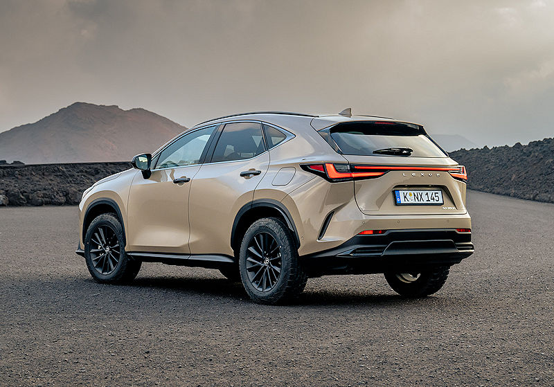 Besonders spannend wird es im Zusammenspiel mit der exklusiven Overtrail-Lackierung Saharabeige. Der warme, fast schon erdige Ton trifft auf die dunklen Kontraste und erzeugt genau diesen spannenden Mix aus Eleganz und Abenteuerlust, der dem NX überraschend gut steht. Ergänzt wird das Farbangebot durch sechs weitere Lackierungen, während der in Grau gehaltene Markenschriftzug am Heck das Gesamtbild dezent abrundet.