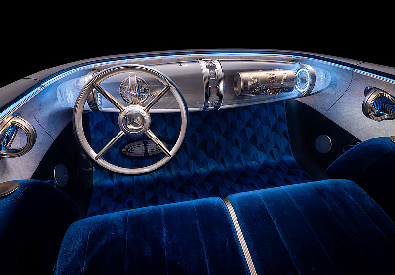 Fahrer und Beifahrer nehmen auf einer tiefblauen Samtbank Platz, großzügig gepolstert, fast wie in einem Art Deco-Salon – ein Raum für Ruhe, Austausch und gemeinsames Erleben. Vor dem Fahrer unterstreicht ein Vierspeichenlenkrad den sportlich-eleganten Charakter des Showcars. Das Mercedes-Logo scheint darin zu schweben, eingefasst in eine gläserne Kugel, die es wie ein Juwel umschließt. Der Boden aus handgefertigter Strohmarketerie, in klassischem Fächer-Dekor, überträgt jahrhundertealte Handwerkskunst in die Moderne. Ein Detail, das den Vision Iconic spürbar lebendig macht.