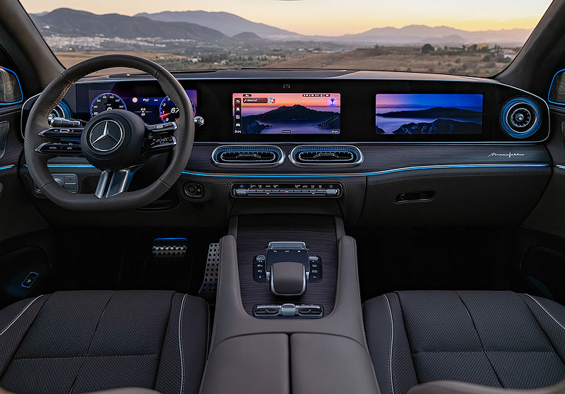 Im Innenraum wird schnell klar, wohin die Reise geht. Der serienmäßige MBUX Superscreen zieht sich als durchgehende Glasfläche über das Cockpit und schafft mit drei Displays eine digitale Bühne, die nicht nur modern wirkt, sondern fast schon etwas Hypnotisches hat. Unterstützt wird das Ganze vom neuen Betriebssystem MB.OS, das den GLS zum bislang intelligentesten Vertreter seiner Baureihe macht. Inklusive Over-the-Air-Updates und einem weiterentwickelten Sprachassistenten, der dank KI auch komplexere Dialoge versteht.