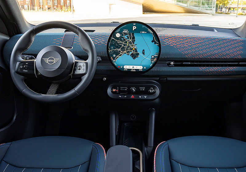 Die verschiedenen Trims setzen dafür umso stärkere Akzente im Ambiente. Der Classic Trim kombiniert ein Drei-Speichen-Lenkrad mit farbigem Textilband und kontrastreiche Strickoberflächen. Der Favoured Trim spielt mit Dark-Petrol-Tönen und orangenen Verläufen, dazu perforiertes Vescin und markante Sportsitze. Der JCW Trim zeigt klare Kante und setzt auf stark konturierte Sitze, mehrfarbige Stoffe, schwarzes Kunstleder, rote Nähte.