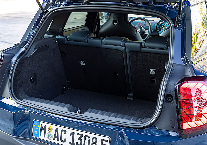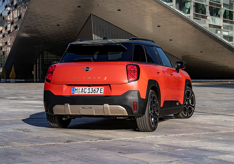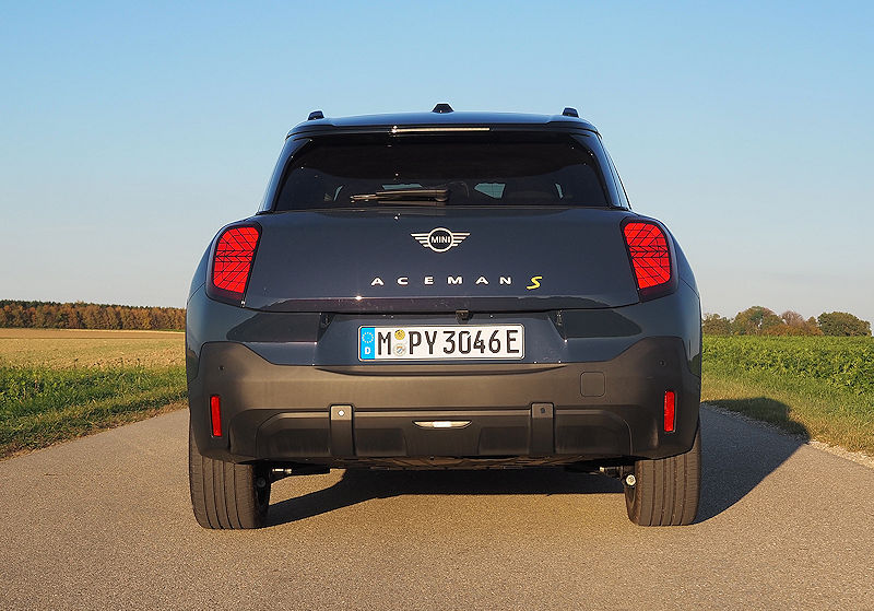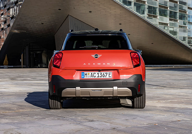 Und wer es maximal sportlich möchte, landet beim JCW Trim. Die vom Motorsport inspirierte Linie trägt eine eigene Front- und Heckgestaltung, setzt auf Schwarz-Hochglanz-Details inklusive JCW-Logo und kombiniert auf Wunsch ein Kontrastdach in Chili Red mit roten Motorhaubenstreifen. Insgesamt wirkt das Heck muskulöser, umlaufende Verkleidungen sind in hochglänzendem Schwarz gehalten. Ein deutlich kräftigerer Auftritt, der den Aceman optisch spürbar „breiter“ wirken lässt.
