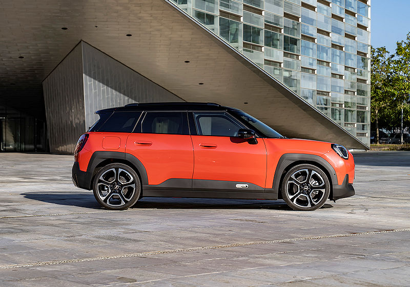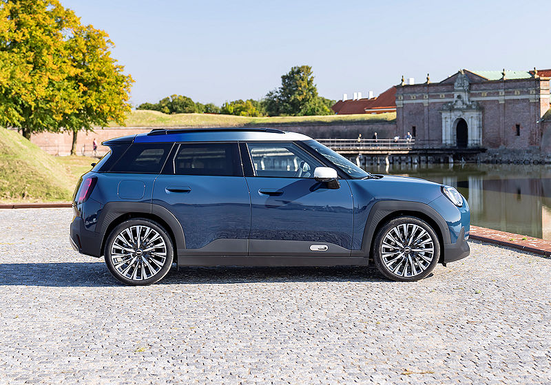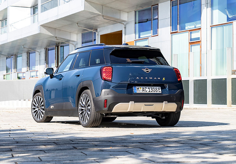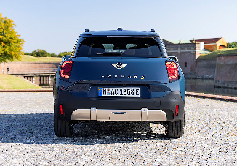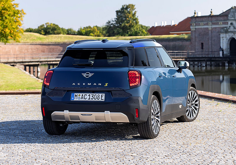 Zum Crossover-Look passen der Unterfahrschutz an Front, Heck und den Seiten, ebenso wie die serienmäßige Dachreling, die den praktischen Anspruch betont. Dazu kommen ausdrucksstarke Karosseriefarben und insgesamt vier Trims, die den Aceman jeweils anders inszenieren – inklusive der MINI-typischen Kontrastfarben fürs Dach. Im vorderen Bereich des Seitenschwellers sitzt ein langlochförmiges Badge, das je nach Ausstattungsvariante im passenden Design ausgeführt ist.