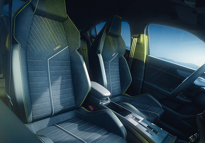 Innen gibt’s Sportsitze mit Alcantara‑Bezügen, gelb abgesetzten Nähten und einer markanten Mittelstreifen‑Linie, dazu ein abgeflachtes Sportlenkrad und Alu‑Pedalerie. Das digitale Fahrerinfodisplay und der zentrale 10‑Zoll‑Touchscreen liefern in Echtzeit Performance‑Daten, G‑Kräfte und Batteriestatus – natürlich im passenden GSE‑Design.