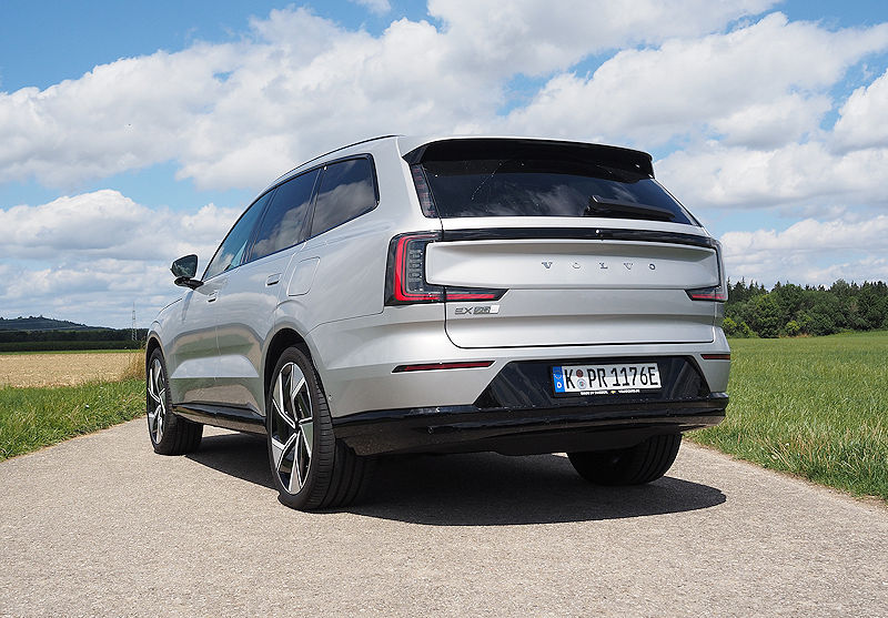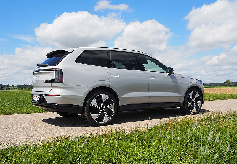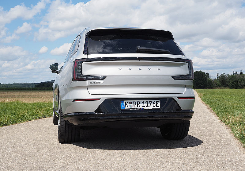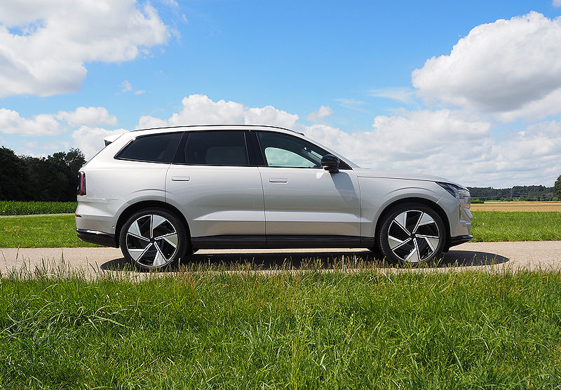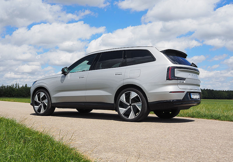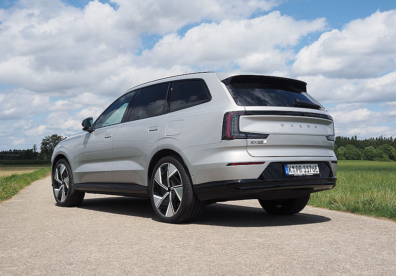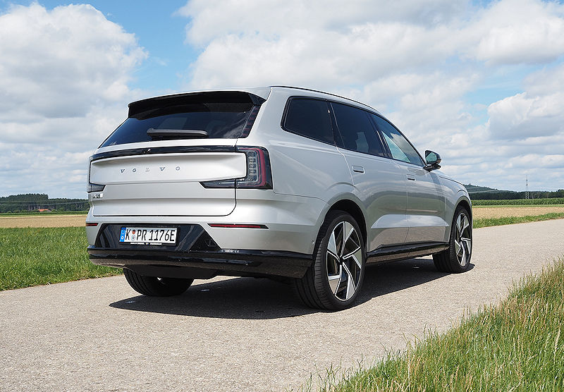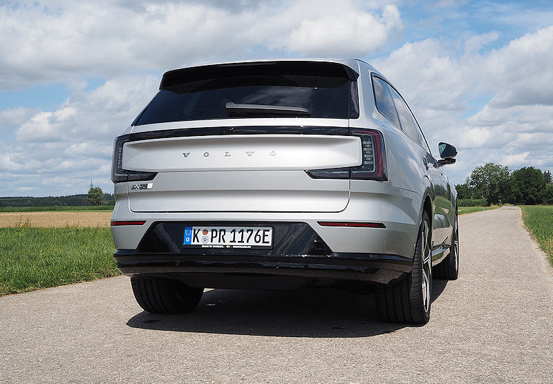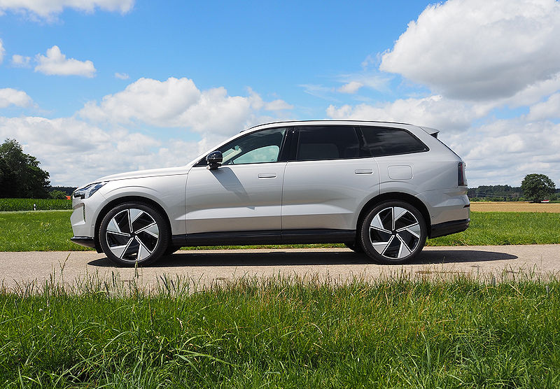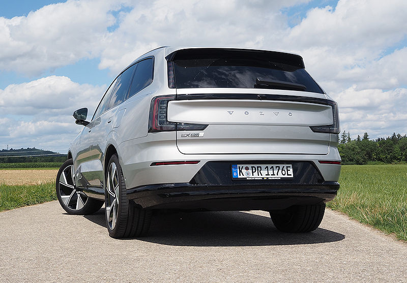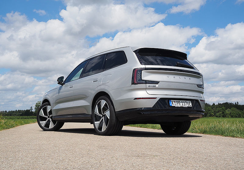 Die Seitenlinie bleibt puristisch. Klare Kanten, sanfte Flächen, die typische trapezförmige Einbuchtung in den Türen, alles wirkt wie aus einem Guss. Türgriffe fahren erst aus, wenn sie gebraucht werden, Scheiben schließen bündig mit den Säulen ab. Es ist dieser Minimalismus, der dem EX90 seine ruhige, hochwertige Präsenz verleiht.