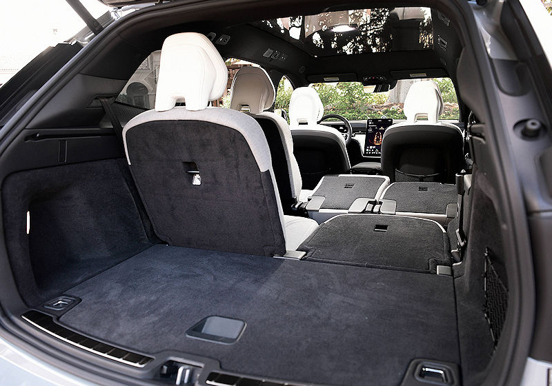 Das Ladeabteil des EX90 ist gerade geschnitten und optimal nutzbar, da keine Radhäuser hineinragen. Schon bei voller Besetzung mit sieben Insassen stehen 324 Liter Stauraum oberhalb des Kofferraumbodens bereit – ein beeindruckender Wert. Wird die dritte Sitzreihe umgeklappt, wächst das Volumen auf 669 Liter, und mit flachgelegter zweiter Reihe entsteht eine fast ebene Ladefläche mit bis zu 1.955 Litern Kapazität.